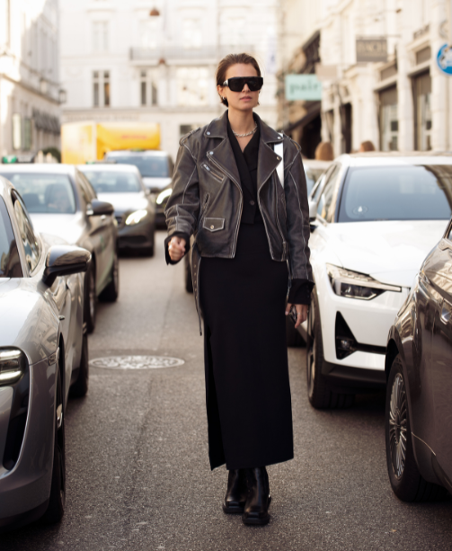 Etwas rockiger wird es mit einer klassischen Bikerjacke aus Leder. Sie eignet sich hervorragend für die Übergangszeit und verleiht dem femininen Maxi-Kleid eine moderne, leicht rebellische Note. Kombinieren Sie diesen Look mit schlichten Ballerinas oder robusten Stiefeln – so sind Sie sowohl tagsüber als auch abends passend gekleidet und wirken zugleich stilsicher und selbstbewusst.