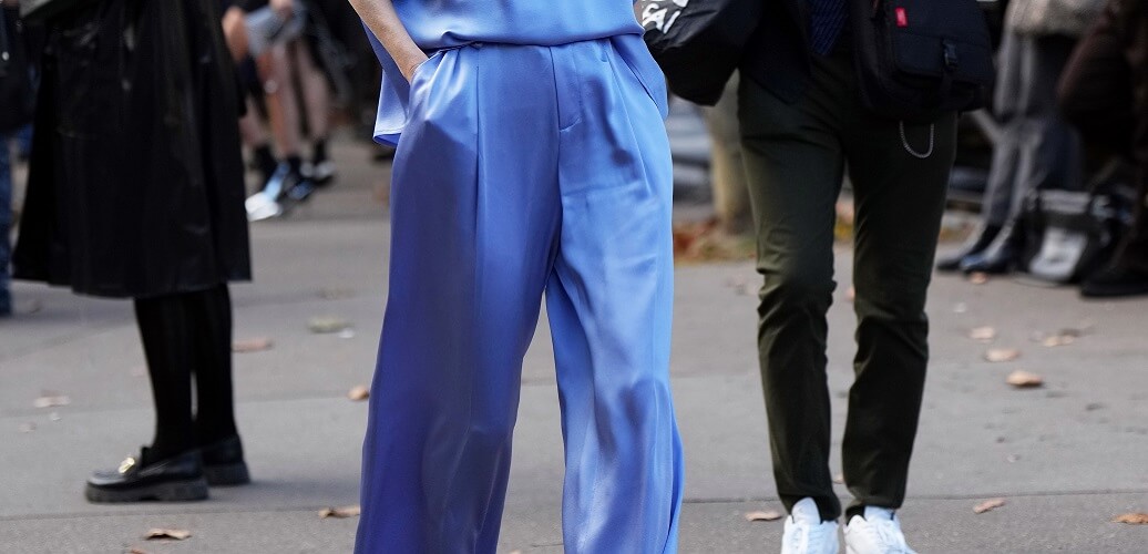 Einer der bedeutendsten Modetrends 2024: Weite Satin-Hosen und Parachute-Pants. Die glänzenden Hosen zählen zu den absoluten Must-haves für dieses Jahr.