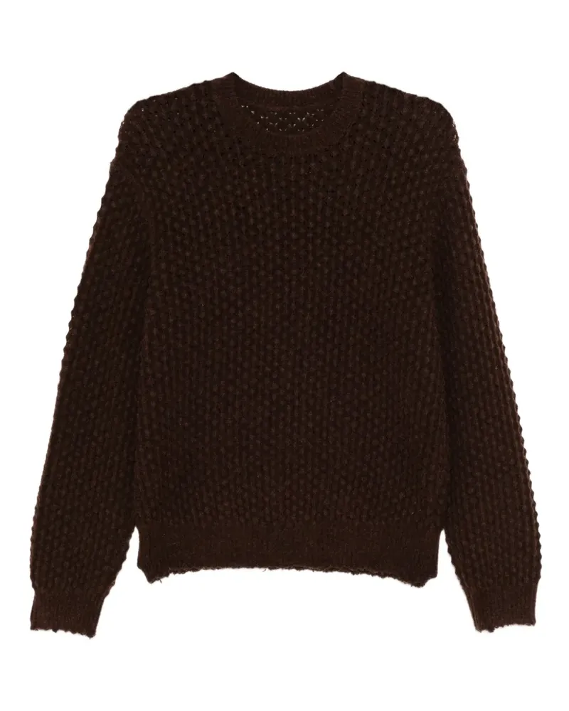Grau Wollgemisch gestricktes Design Blumenstickerei Distressed-Look runder Ausschnitt