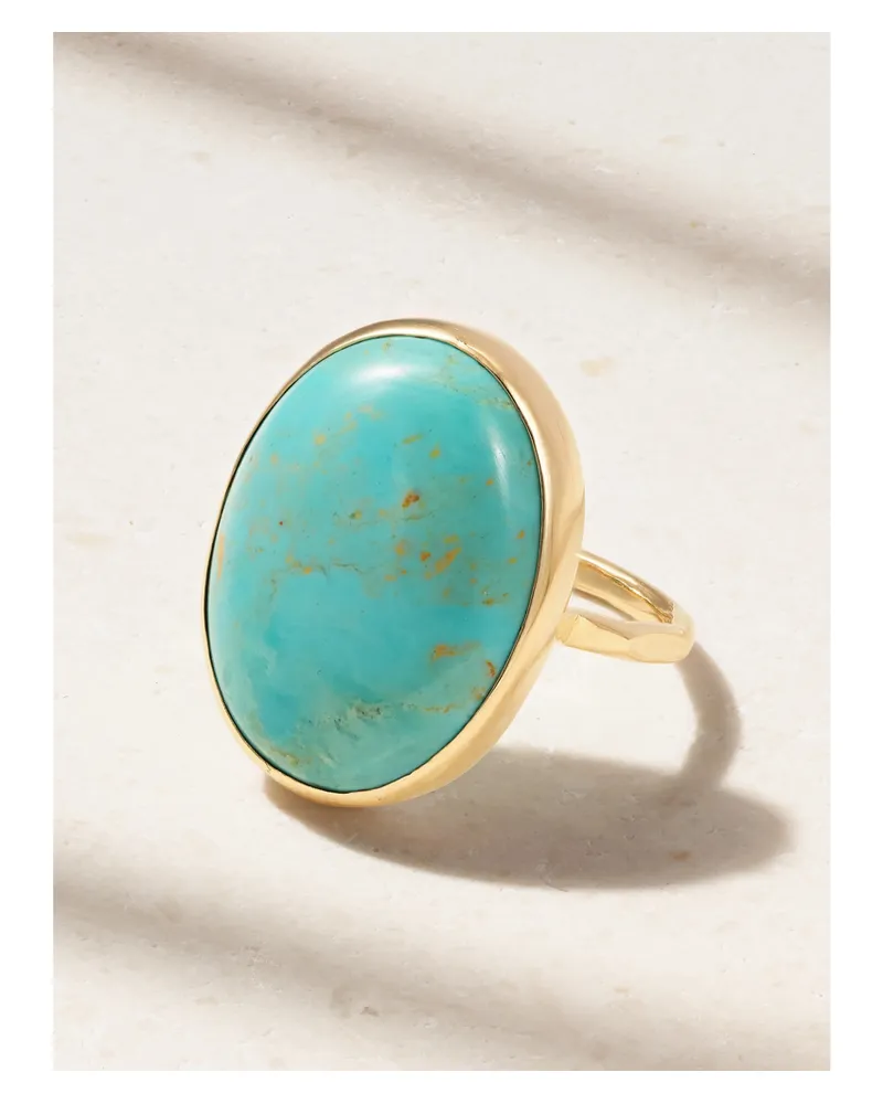 Melissa Joy Manning begeistert sich für Reisen, Kunst und Kultur – in den Schmuckstücken, die sie für ihre gleichnamige Marke kreiert, spiegeln sich jene Interessen wider. Der handgefertigte „Cityscape“ Ring aus recyceltem 14-karätigem Gold zeigt sich mit fünf Aquamarinen, deren Anordnung an die „Silhouette eines Stadtbilds“ erinnern soll. Den Edelsteinen wird zudem nachgesagt, dass sie die Selbsterkenntnis fördern.